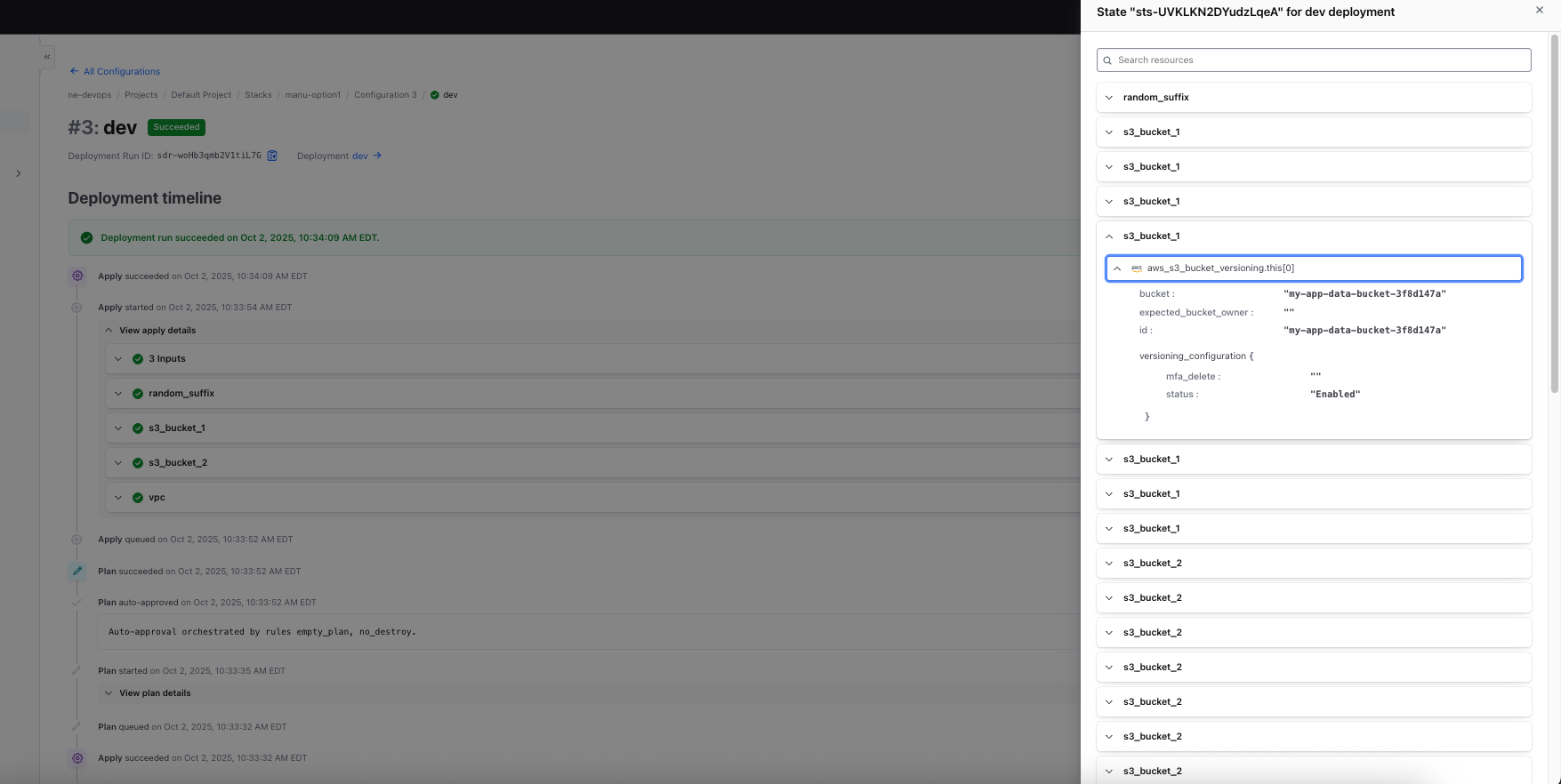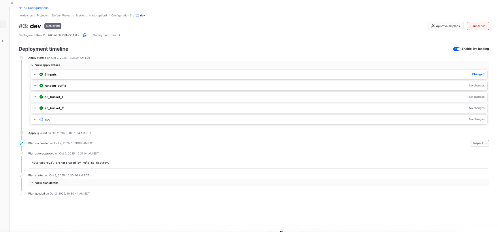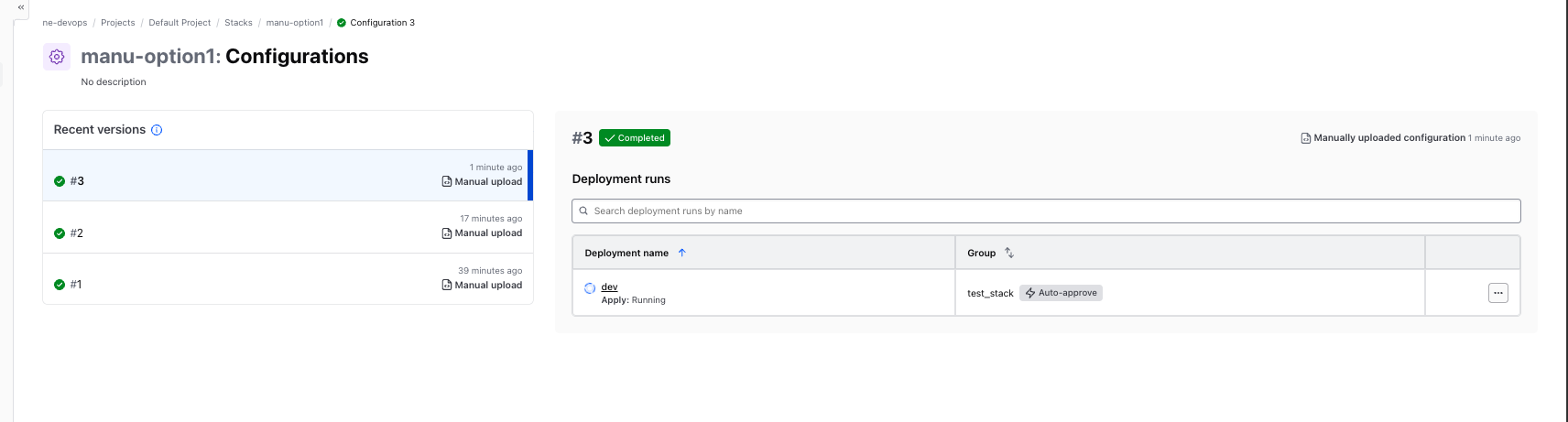 file. I did make a mistake on my configuration and had to run the configuration upload twice. So you will see configuration versions up to 3 in the list when we do those. With the auto-approve on: