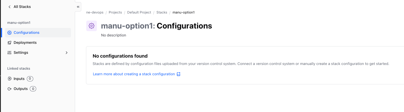 I am going to use one of the stack ids from the create operations we did earlier. As expected, there are no configuration items associated with the stack manu-option1