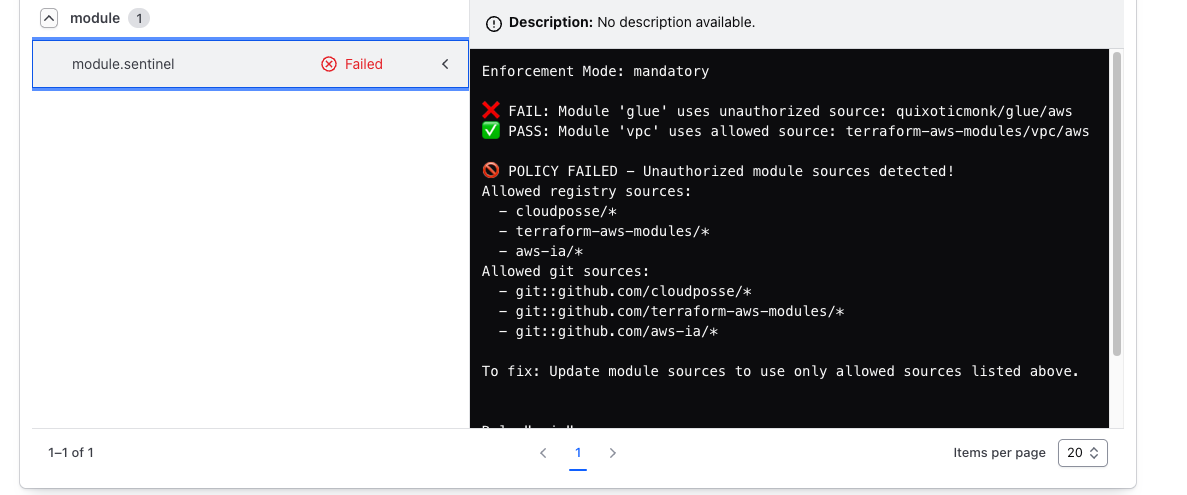 This policy validates module sources during plan and apply operations, blocking runs that use unauthorized modules.